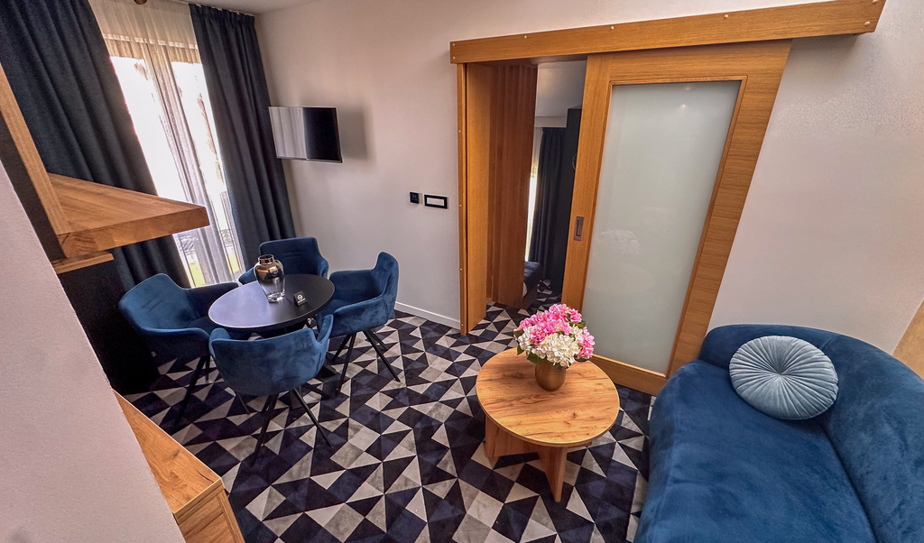 Apartman nudi vrhunski komfor i prostranost, savršen za goste koji žele dodatnu privatnost i udobnost. Pored udobne spavaće sobe, apartman posjeduje mini dnevni boravak idealan za opuštanje, kao i trpezarijski sto koji omogućava ugodan prostor za obroke ili rad.