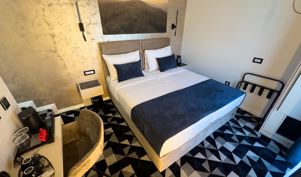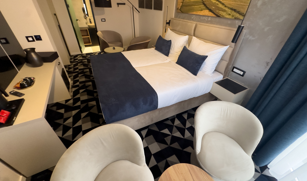 Dvokrevetna soba sa bračnim krevetom pruža udoban i elegantan prostor idealan za parove ili goste koji žele dodatnu komfor. Soba je opremljena prostranim bračnim krevetom, modernim kupatilom, TV-om, klimom i besplatnim Wi-Fi internetom, stvarajući prijatan ambijent za opuštanje i bezbrižan boravak.